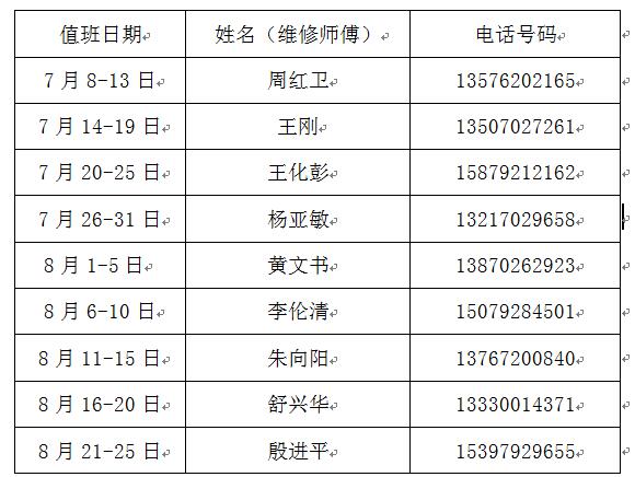 暑期期间水电维修小修值班安排如下,请需要进行水电维修小修的用户按照安排表拨打维修人员电话。