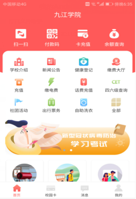 2.登录易校园,进入首页,直接点击右上角的“绑定校园卡”,输入搜索“九江学院”点击确认,然后输入“姓名”“学号或工号”进行校园卡绑定,绑卡成功后可以开始具体的应用使用,如图3,4,5所示。