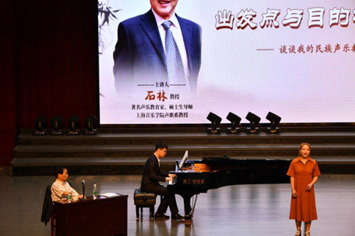 讲学半部分,石林教授首先介绍了上海音乐学院声歌系民族声乐方向对研究生培养的方向与学习顺序,紧接着给师生们介绍其五十年的民族声乐教学心得:从声乐的呼吸、咬字吐字、发声及作品处理都进行了详细的讲解,分享了其个人教学经验。讲学后半部分,石林教授进行了现场教学。艺术学院师生分别演唱《清流》《二月见罢到如今》《千古绝唱》《越人歌》等作品,石林教授严谨的治学精神、针对性的教学方法,使现场的师生们深受感染。晚上石林教授研究生高飞云女士在音乐厅举办了个人独唱音乐会,现场反响热烈。艺术学院孔江闽老师参加了交流演出。
