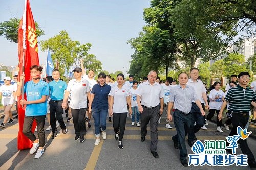 申雪、陈小林和江西广电都市频道、江西省体育总会、九江市体育局、团市委、我校有关部门负责人为各方阵授旗。随着发令枪响,申雪、陈小林领走万人健步走,引导所有参赛者共赴一场青春之旅。两千多名参与者组成的队伍从九江学院西门主会场起点处开始,步伐矫健,激情开走,在这里没有名次,只有欢乐,大家个个精神饱满、有说有笑,现场的气氛欢快而温馨。
