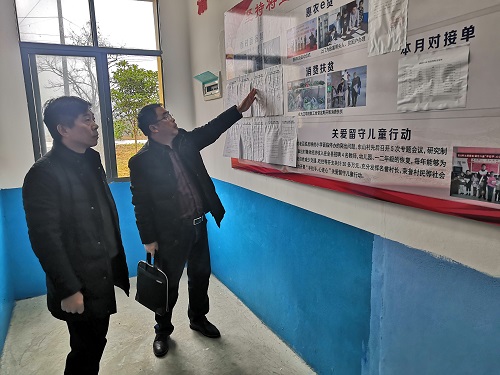 李广欣一行来到精准扶贫办公室,查看工作队工作台账和驻村工作记录,随后在二楼会议室召开调研座谈会。官莲乡乡长邓卢武、扶贫工作队队员江山分别就乡村两级做好脱贫攻坚工作、驻村工作队落实上级驻村要求和学校党委脱贫攻坚决策部署情况作了详细汇报。