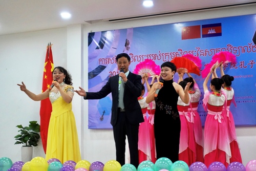 柬埔寨皇家科学院孔子学院12月22日举行成立10周年庆典暨“2019‘一带一路’中柬友好关系之命运共同体”研讨会。九江学院师生代表团一行26人参加柬埔寨孔子学院成立10周年庆典,并在柬埔寨进行中国文化巡演、中国书画作品巡展、专家巡讲并参加研讨会。
