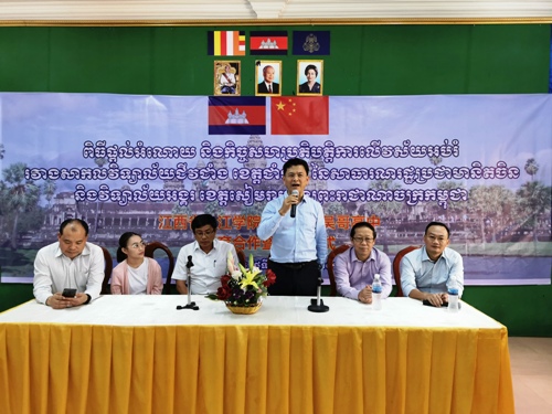 在柬埔寨访问期间,刘晓东一行拜访中国驻柬大使馆;访问了吴哥时报(今日吴哥)编辑部,出席了吴哥时报九江学院学生实习基地揭牌仪式;到访了暹粒省吴哥高中孔子课堂并代表学校向吴哥高中(孔子课堂)赠送教学、办公设备。