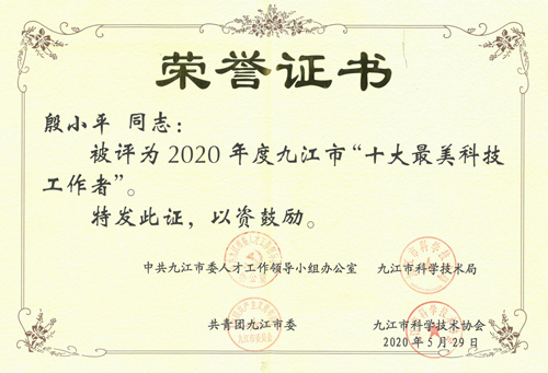今年的“全国科技工作者日”,九江市为大力宣传奋战在经济社会发展一线的科技工作者,充分展现广大科技工作者劳动、奋斗、奉献的楷模形象,在广泛发动、层层推荐、资格审核、专家评选的基础上,研究选树了“十大最美科技工作者”、“十大最美青年科技工作者”、“十大最美科普工作者”等先进代表。九江学院附属医院殷小平博士以其在医疗科研上的重要成果、科研人才培养上的杰出成就以及在疫情防控等医疗卫生工作中的突出贡献,被选树为“十大最美科技工作者”。市委书记林彬杨等为其颁发了荣誉证书。