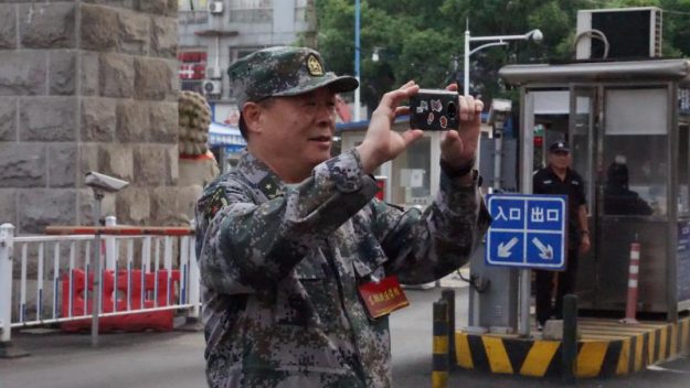 “当年我就住在这里的三楼。”将军又拿出手机对着濂溪宾馆三楼的一个窗户,拍起照来。1999年夏天,时任旅长的傅勇将军带领官兵第二次驰援九江,他就住在我校濂溪宾馆的三楼房间。