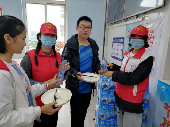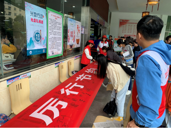 “同学你好,我们现在倡导“光盘行动”,你只要吃完打来的饭菜,展示光盘就可以免费获得九院定制版的矿泉水哦!”“老师您好,我们在开展节约粮食的志愿行动,欢迎您加入光盘一族”。这几天,一走进九江学院的食堂,食堂里的“光盘劝导员”和志愿者们就会热情地向就餐师生介绍光盘赠礼活动,并向师生们宣传节约粮食、杜绝浪费的知识。