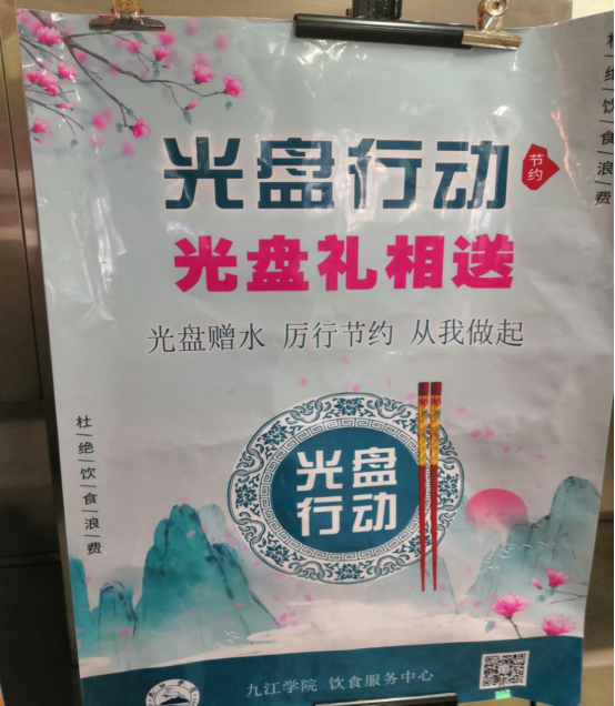 走进九江学院的食堂,随处可见各类节约粮食的标语横幅。“与文明握手,向陋习告别”、“节俭不是小气,而是一种文明,请珍惜粮食,按需取餐!”等字眼随处可见,提醒师生不要浪费粮食。身上佩戴“光盘劝导员”“文明用餐督导员”袖章的志愿者,不时地穿插在人群中,劝导师生节约粮食,避免浪费。