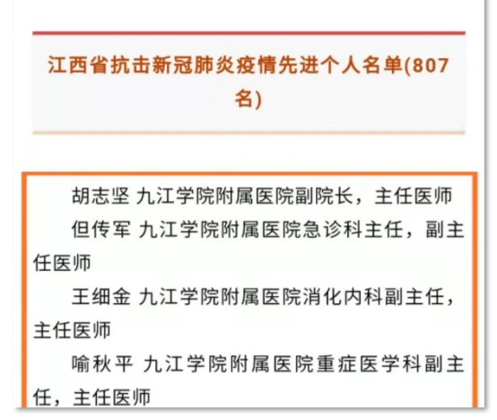 近日,中共江西省委、江西省人民政府作出关于表彰江西省抗击新冠肺炎疫情先进个人和先进集体组织的决定。我校附属医院援鄂医疗队临时党支部获得“江西省抗击新冠肺炎疫情先进集体”和“全省先进基层党组织”称号。我校附属医院副院长、主任医师胡志坚,附属医院急诊科主任、副主任医师但传军,附属医院消化内科副主任、主任医师王细金,附属医院重症医学科副主任、主任医师喻秋平分别获得“江西省抗击新冠肺炎疫情先进个人”称号。