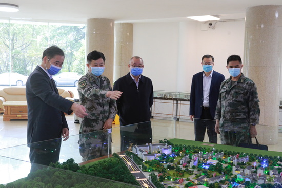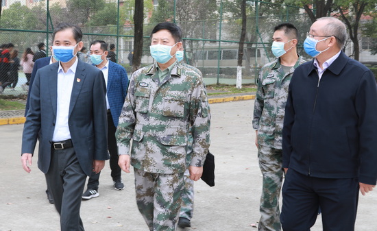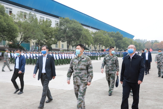赵伟、陈小林陪同九江军分区司令员丁庆顺看望我校2021级军训新生
