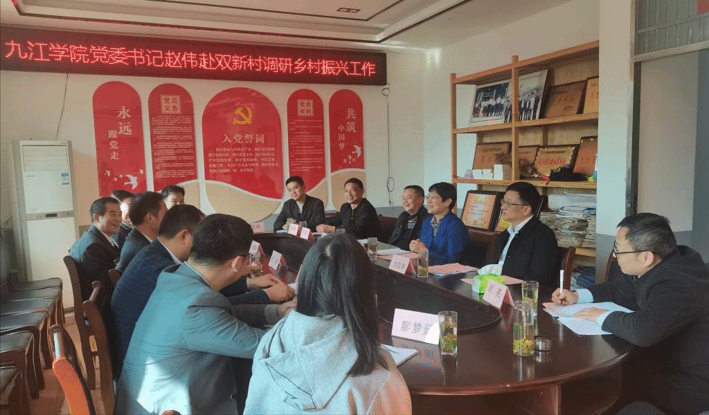 随后,赵伟一行在双新村村委会参加了双新村乡村振兴座谈会。会上,武宁县委书记洪碧霞、县委副书记刘名寿对赵伟一行的到来表示热烈欢迎,对九江学院对双新村的帮扶表示感谢,并介绍了全县乡村振兴工作情况,表示期盼在九江学院的帮扶下和各方的努力下,双新村能发生一个新的变化。