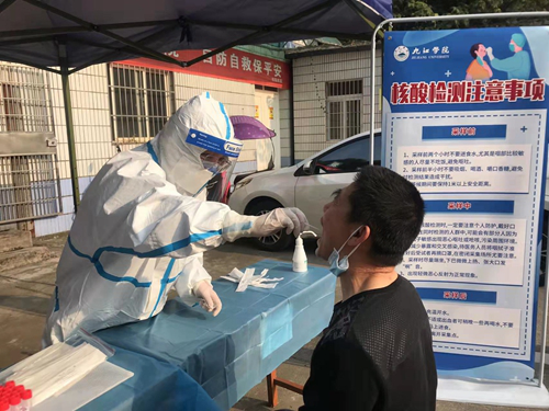 10月30日,江西铅山县通报一例新冠肺炎确诊病例;10月31日,九江市柴桑区通报发现一例新冠病毒核酸检测阳性人员。江西、九江疫情防控形势顿时严峻起来。为保障师生健康,防范新型冠状病毒传播,九江学院坚决贯彻落实习近平总书记重要指示精神和省委部署要求,根据九江市最新疫情紧急风险提示,积极响应,多措并举,把疫情防控作为当前头等政治任务来抓,坚定信心,全力以赴,坚决打赢疫情防控阻击。