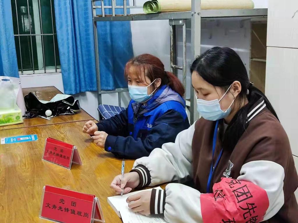 这些志愿者有的在核酸检测现场,坚持辅助医护人员维持秩序,组织师生有条不紊地进行核酸检测;有的伫立在宿舍楼下,为进宿舍的同学们测量体温,督促大家戴口罩,进行消杀,并对其他人员出入宿舍的情况进行登记。