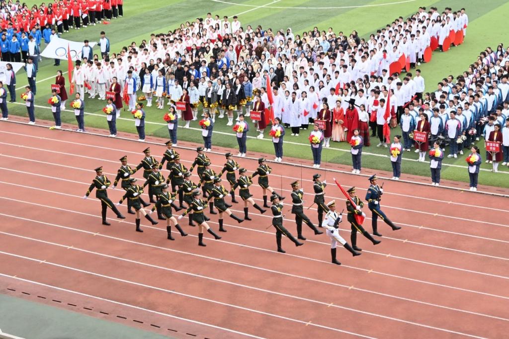 在雄壮激昂的乐曲声中,国旗护卫队、鲜花方队、彩旗方队、裁判员方队、各二级学院方队以及研究生方队、教职工方队依次入场。他们以整齐的步伐、昂扬的姿态走过主席台前,充分展现出九江学院师生的活力与风采,二级学院各具特色的精彩亮相也引起了全场观众的热烈反响,场上的掌声与喝彩声连绵不绝。