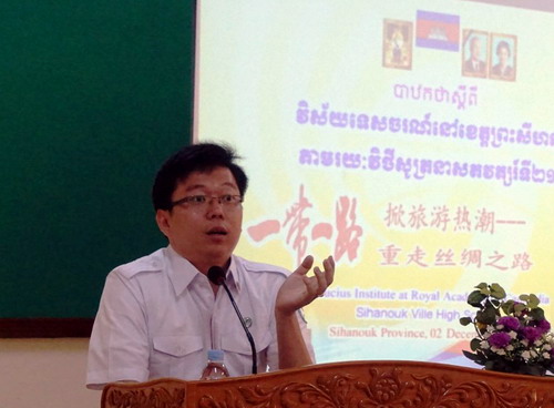 12月2日,柬埔寨王家研究院孔子学院西哈努克省高级中学汉语中心举办“一带一路”旅游文化节活动。柬埔寨王家研究院孔子学院院长谢莫尼勒博士(HE Chea Munyrith)、西哈努克省高级中学校长高吴提(Khov Vuthy)先生受邀出席并致辞,西哈努克省高级中学汉语中心柬方负责人王浩(Nivoth)、中方负责人李智老师和汉语中心师生100余人出席活动。