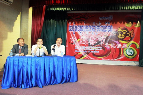 帅式毅院长做了“过年·春节”主题讲座。他从中国春节的由来和习俗、柬埔寨中国新年活动、以及中柬新年对比等三个方面,做了深入的调查和研究。帅院长深入浅出的阐释方法和轻松明快的演讲风格赢得了到场的各位领导、老师们和同学们的一致好评。帅式毅院长鼓励王家文化与艺术大学的同学们能努力学好中文,争取机会去中国留学深造。谢莫尼勒阁下亲自作翻译并根据柬埔寨的实际情况作了很好的补充。