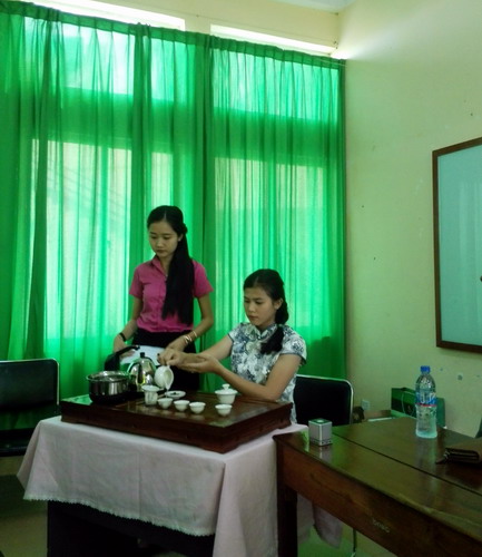 在介绍清明和冬至的过程中,还穿插了中文系学生自编自演的茶艺表演,茶是中国人日常生活中不可缺少的东西,茶艺是具有浓厚汉族特色的中国传统文化,体现了中国人独特的审美观念。同学们娴熟的表演,优雅的气质,生动的讲解赢得了观众的阵阵掌声。