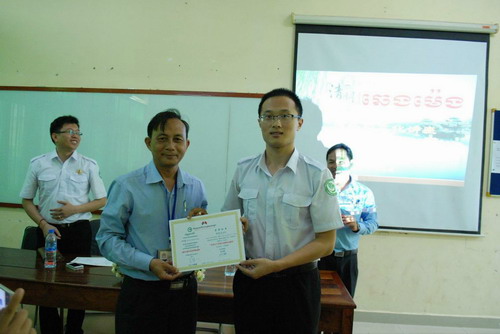 赵雨老师的讲解结束后,谢莫尼勒院长和谢索恩副校长给棉芷大学中文系颁发了“2015年最佳团队”奖状和奖金,给唐慎龙老师颁发了柬埔寨王家研究院孔子学院2015-2016学年第一季度“优秀孔子学院汉语教师志愿者”奖状和奖金。