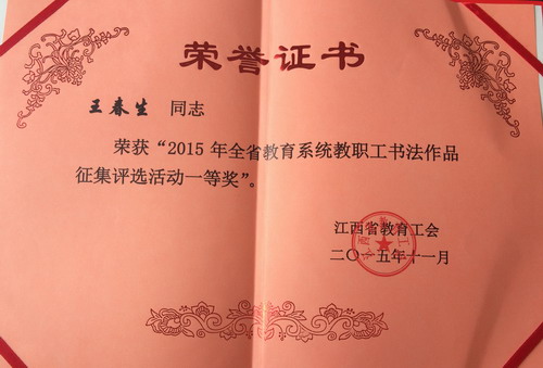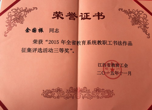 此外,2015年由江西省教育工会举办的全省教育系统教职工书法作品征集评选活动中,我校报送的两件作品均获奖,分别是艺术学院王春生获得“2015年江西省教育系统教职工书法作品一等奖”;退休职工余国振获得“2015年江西省教育系统教职工书法作品三等奖”。