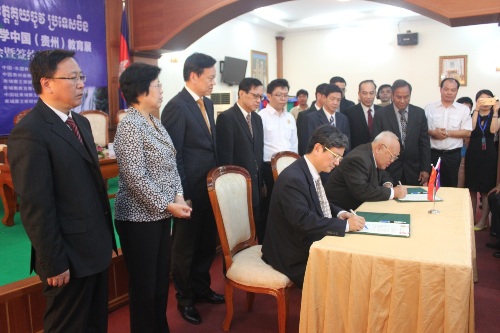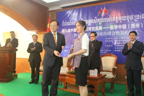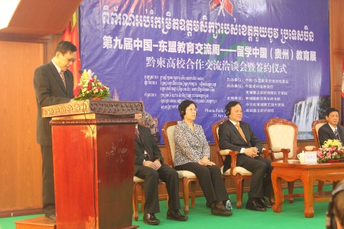 4月25日,第九届中国—东盟教育交流周留学中国(贵州)教育展暨黔柬高校合作交流洽谈会和签约仪式在柬埔寨王家研究院孔子学院顺利举行。正在柬埔寨访问的中国贵州省委书记陈敏尔、中国驻柬大使馆大使布建国、柬埔寨教育青年体育部国务秘书(副部长)约克诺伊(H.E. YUOK Ngoy)、柬埔寨王家研究院副院长逊春文院士(H.E. SUM Chhum Bun)、中国贵州省教育代表团、柬埔寨政府官员、孔子学院师生及当地大中学生代表等1000余人出席教育展及有关活动。