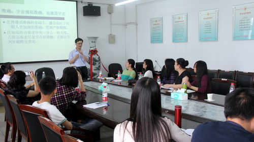 有声语言是教师授课最主要的工具,但是高频率、大强度的用嗓工作使咽喉炎、声带损伤成了教师的常患病,直接影响着教师的教学工作。如果教师能掌握一些科学的发声技巧,不但能够有效保护嗓子,还能够提高声音的美感,提升课堂教学效果,因此科学的发声训练和嗓音保护对教师来说显得尤为重要。活动中,廖老师将播音员的发声技巧迁移到教师的课堂教学发声中,详细讲解了发声的特点、类型,剖析了科学发声原理,从教师授课时如何用话筒、音高的调节、音色的使用、发声的训练、吐字、嗓音在课堂教学及生活中的保护等方面进行了专业指导,并向在座教师示范了科学的练声方法。