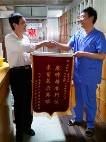 为了确保手术顺利进行,麻醉科首先为老人身体状况进行评估,制定麻醉方案。由于老人腰椎接受过等多次手术,所以对心肺等重要脏器功能评估需格外谨慎,评估后,麻醉科聂鹰副主任为周大爷制定了一套详细的全身麻醉方案。4月28日,老人在全麻下接受了手术治疗,并顺利在麻醉恢复室苏醒,安全送回病房。术后老人恢复良好,顺利康复出院。他特意送来一而书有“麻醉精准到位,术前幕后英雄”的锦旗,致谢聂鹰副主任、邓威医师和麻醉科全体医务人员。