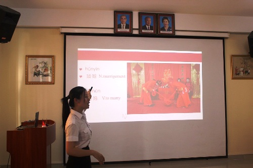 首先,许老师用剪纸剪出的不同颜色的“喜喜”字吸引了学生目光,并询问学生该字的意义和应用的场合。学生们准确地回答出了教师的提问,并解释说喜字现在在柬埔寨的婚礼中也在使用。随后,许老师用了不同的中国结婚服饰图片展示给学生,让学生了解中式婚礼。因为参加文化讲座的学生大部分为对汉语有浓厚兴趣的初级学者,所以,许老师用了很多通俗易懂的词语,并教授学生有关婚礼的实用字词,学生们学得很认真,积极努力地配合教师讲座的每一环节。
