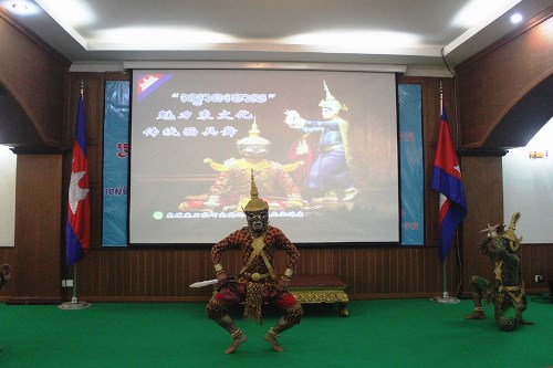 谢莫尼勒阁下主讲的中柬文化沙龙之“魅力柬文化传统面具舞”掀起了活动的高潮。柬埔寨文化艺术部文化艺术学校的演员们表演的传统面具舞伴着柬埔寨的传统打击乐器的演奏,通过演员们富有张力的舞蹈动作,为大家呈现了史诗故事《罗摩衍那》(Ream Ker)的视觉盛宴。