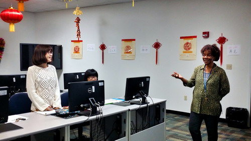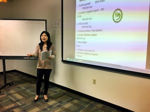 美方院长首先对孔子学院教师表示欢迎并介绍了孔子学院的基本情况,展示了自2014年成立以来,萨凡纳州立大学孔子学院在汉语教学、组织汉语考试及推广中国文化等方面作出的努力。随后,中方院长罗其娟对2016年上半年至今的工作进行了回顾,从孔子学院的教学对象群体、学生人数、课程设置、课堂管理、教师发展、文化活动等几个方面做了总结,在肯定成绩的同时也指出了目前孔子学院在发展过程中遇到的困难与挑战,希望老师们能够积极地献计献策,在做好教学工作的同时,能够配合举办更多的特色文化活动,扩大孔子学院的影响力。
