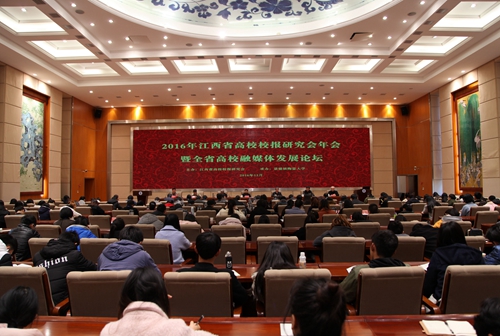 16日上午,在景德镇陶瓷大学湘湖校区学术报告厅举行2016江西省高校校报研究会年会暨全省高校融媒体发展论坛开幕式。