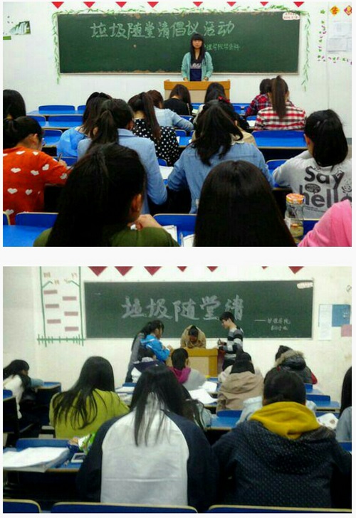 一是积极开展“随手捡,随堂清”活动,营造干净清爽的课堂环境。第一,通过学生科、团委布置的主题班会、团日活动等宣传“随手捡、随堂清”活动,强调活动的意义,要求各个班级积极宣传“随堂清”活动。第二,发挥各班的主动性,开展形式多样的活动,诸如“教室卫生,从我做起”活动倡议、关于教室卫生讨论等。第三,加大教室卫生的检查力度,开展教室卫生评比活动。“随手捡、随堂清”活动,取得了良好的效果。第四,团委组织班级黑板报主题评选活动,将国学素质养成融入班级黑板报中,为强化同学们特色教育培养、美化学习生活环境起到了很好的促进作用。