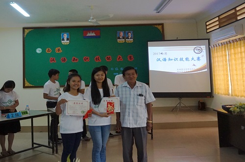 经过激烈的角逐,汉语中心的谢金莲(KEO Sophea)和符珍恩(HOUR Kimoeung)两位同学赢得了一等奖。高吴提校长为她们颁发了获奖证书与奖金。