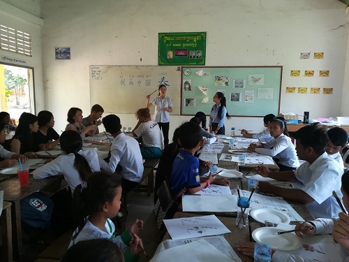 2月6日,柬埔寨王家研究院孔子学院西哈努克省高级中学汉语中心在西哈努克省高级中学举办春节系列活动之“我画中国春”。中国画分为三类:人物、花鸟、山水。本次活动为学生展示的是花鸟画,表现出中国人与自然和谐相处的观念和思想。此次活动由汉语中心志愿者教师卞玥老师和赵丽萍老师主讲,西哈努克省教育厅林江老师(Lim Kheang)、中方负责人李智老师及汉语中心中午班和晚班学员100余人参与。