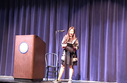 最后,在人文艺术学院肯尼迪剧院里,陈美玲声情并茂地朗诵了多篇自己的作品,并在朗诵会后与师生进行了交流,并向孔子学院赠送了自己的作品集,为本次诗歌品读会画上了圆满句号。人文艺术学院美术、人文及健康系主任尼古拉斯·西尔伯格表示,孔子学院举办的这场活动为我们打开了一扇文化互视的大门,我们的师生在与诗人交流的过程中也在思考着自己的种族和文化身份。可以看出,陈美玲别具一格的诗风引起了学生们广泛而热烈的讨论,这对提高学生的艺术鉴赏和创作能力起到了很大的推动作用。