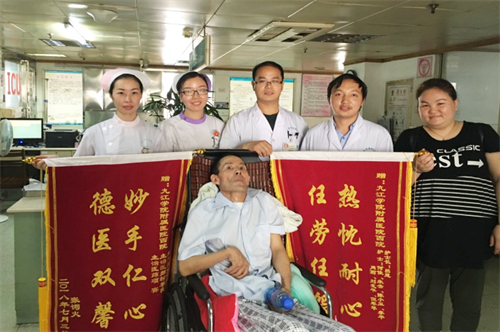 患者张某,55岁,去年10月因车祸造成急性重型颅脑损伤合并多发伤,入院时,患者已神志不清,大量呕吐胃内容物,头部、颜面部及胸腹部、四肢多处挫伤及擦伤,大小便失禁。头颅CT提示:左侧额、颞、顶部及右侧额部硬膜下出血,右侧额部头皮血肿,生命危在旦夕。经神经外科赵浪平主任,柯尊良、项赛医师及护理人员的奋力抢救,终于将患者从死亡线上拉了回来。术后患者极其消瘦,一直处于昏迷状态,气管切开,留置尿管、胃管,持续低热,给治疗和护理带来了难度。经过不断调整治疗方案,一个月后,患者病情趋向稳定,从神经外科icu转至普通病房。60多天后,患者终于苏醒。在近9个月的长时间精心治疗和护理下,患者意识转为朦胧状态,一侧肢体可移动,有了简单的语言表达能力,终于可以出院。出院当天,家属送来两面锦旗表达了对医生和护理团队的感激之情。