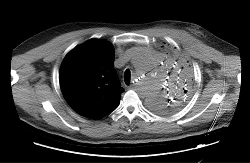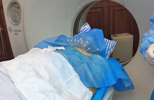 56岁的贵先生确诊左肺鳞癌两年半,两年来先后在多家医院给予放射治疗、多周期化疗、抗血管生成药物及靶向药物治疗等。近期病情再次加重,多次出现大咯血等情况,患者及家属一度绝望,后辗转到临床医学院/附属医院。呼吸内一科医生根据患者病情进行多次讨论,决定在咯血稳定后,为患者实施肿瘤内碘125I粒子植入术。此次手术为该院首例CT引导下肺癌放射性粒子植入术,过程顺利,术后CT显示粒子分布良好,经后续监护及观察,患者无特殊不适,原有胸痛胸闷症状明显缓解,达到治疗预期效果。据悉,碘125I粒子植入术作为组织间近距离放疗的一种新手段,自被证实为治疗肺癌安全有效、无严重副作用的治疗手段以来,国际国内正逐步开展,打开了肿瘤微创治疗的新篇章,临床医学院/附属医院呼吸一科紧跟学科发展,积极引进,为癌症患者带来了福音。