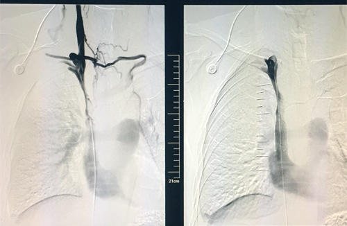 48岁的章先生近期因咳嗽、胸闷入临床医学院/附属医院就诊,不幸确诊为肺癌晚期,伴上腔静脉重度狭窄,逐渐出现颜面部及上肢浮肿,胸壁浅表静脉扩张,并有显著胸闷及颜面部肿胀。为提高患者生活质量,延长患者生存期,该院呼吸内一科介入组决定为其实行上腔静脉支架置入,经术前充分评估,术中精细操作,以20分钟完成支架置入。术后,上腔静脉再通,胸壁“蚯蚓”消失,症状瞬间缓解,达到立竿见影的治疗效果,赢得患者及家属的高度称赞。