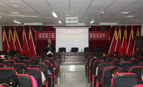 政法学院副院长李德恩、九江市科学技术协会调研员齐全国、九江市教育学会会长黄福林出席开坛仪式并致辞。政法学院副院长李德恩教授在致辞中首先代表政法学院欢迎来自全市各中小学校的心理健康教育的专业教师和班主任以及九江市各高校及兄弟单位的心理健康教育专家们参加论坛,然后向大家介绍了九江学院政法学院近年来在学科与专业建设、科学研究、师资队伍建设等方面的发展概况及其远景规划,并向大家重点介绍了心理教研室在近几年中在心理学实验室建设、应用心理学本科专业建设、教学与科研团队建设等方面所取得的进步,尤其是在心理学的社会服务方面所取得的成效。