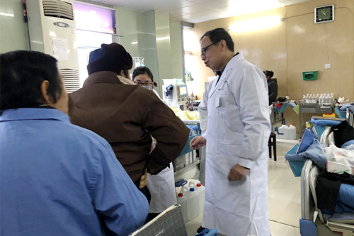 当日,临床医学院/附属医院肾内科主任高新庐、主治医师黄赟、护士长曹红杏等一早驱车前往都昌县人民医院。到达该院后经过了解,该院肾内科有不少维持血液透析患者合并继发有甲状旁腺功能亢进,且医院的治疗手段主要是以药物调节钙磷代谢紊乱。针对都昌县人民医院肾内科实际需要,高新庐主任等通过现场查房的方式对患者义诊,并对科室医生进行了实例指导。