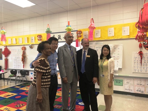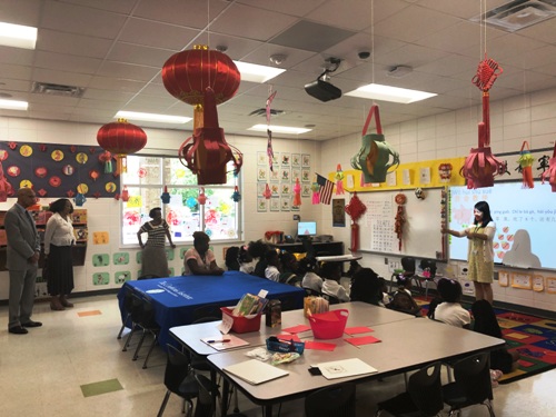 佐治亚州教育厅专员、世界语言专家帕特里克·华莱士博士(Patrick Wallace)、萨凡纳前任市长奥帝斯·约翰逊先生 (Otis Johnson)、萨凡纳市公立学校语言课程指导办公室主任、世界语言专家马克·林斯基博士(Mark Linsky)、萨凡纳市教育局小学部主任瓦勒莉· 凯夫博士(Vallerie Cave)等教育行政主管官员,在萨凡纳州立大学孔子学院外方院长佩吉·布拉德博士(Peggy Blood)、中方院长吴登丰博士和海文小学校长迪安·杨女士(Dionne Young)的陪同下,兴致勃勃地参观了多姿多彩的汉语课堂,观摩了齐彩平老师的精彩授课,欣赏了学生语言能力表演,包括唱中文歌、背唐诗、做算术、玩游戏等。大家被孩子憨态可掬的模样逗乐了,更对他们标准流利的汉语深感赞叹。