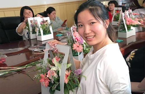 主题讲座后,产科特别邀请了花艺老师,为在场准妈妈们讲解鲜花知识、指导插花技巧。通过手把手的教授,事先准备好的鲜花等原材料,在心灵手巧的准妈妈们手中变成了一个个多姿多彩的花蓝。