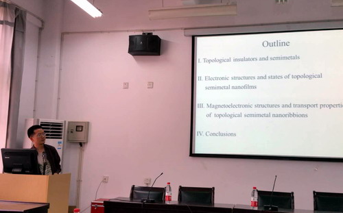 周光辉教授、周小英博士、肖贤波教授分别作了题为“Graphene-Fundamental and Device Physics”、“锯齿型黑磷纳米带电子结构与光学性质”、“拓扑半金属纳米条带磁电输运”的报告,三位教授从凝聚态物理的前沿研究方向,在二维材料的构造及其微结构、纳米特性、光学性能等方面给大家带来了最新最前沿研究成果的阐述。