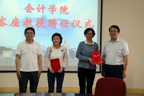 在热烈的掌声中,会计学院领导向张蕾和吴萍颁发了客座教授证书,蔡报纯介绍了两位客座教授的基本情况。