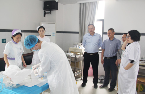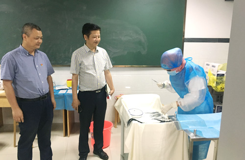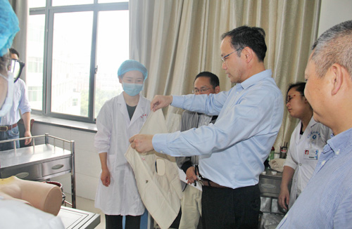 张南华书记一行先后到临床技能中心考场,对考试各站依次进行巡视。在501考场第六站腹部穿刺操作考试现场,殷小平副院长全程认真观看了一名考生的操作,并听取了考官的现场点评,然后针对考生的不足之处,为其示范规范操作。