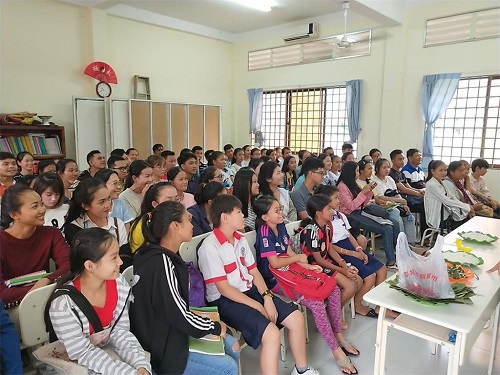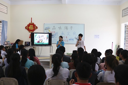 “五月五,是端午。”又到了一年一度的端午节,为了使学生们对于中国传统节日有更深入直观的感受,同时进一步加强中柬文化交流,暹粒吴哥高中全体汉语教师为学生们精心组织了一场别开生面的庆端午活动。6月7日下午五点,“品味端午,传承文化”主题活动在暹粒吴哥高中孔子课堂102教室举行。本次活动共分为三大环节,分别为端午知识讲解、包粽子示范与体验以及有奖知识问答。志愿者教师曾一舫及其学生李俊杰(Seng tangmouyly)担任主讲,一百余名学生参与活动。