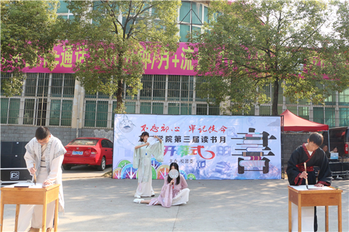 开幕式上,文学社学生代表彭英分享了自己读书的乐趣,向全体学生发出读书倡议,号召同学们积极参与到读书月活动中来。南山国学社的汉服表演、武术协会的中国功夫展现了中华传统文化的独特魅力。读者协会朗诵了《读书点亮人生》,配合现场书法和古筝表演,朗诵热情洋溢,饱含激情,表达了新时代大学生的精神风貌,将开幕式的气氛推向高潮。活动现场还开展了藏书交流活动和学生书画作品展览。