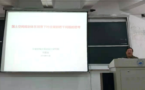 刘复友副院长作了题为《国土空间规划体系背景下村庄规划若干问题的思考》的学术报告。他的报告主要介绍了安徽省美丽乡村规划建设回顾;国土空间规划体系构建对村庄规划的新要求;新要求下村庄规划面临的新课题;新时代村庄规划应关注的重点内容等前沿问题,并以他亲设计的一个完整的村庄规划作为案例阐述了上述前沿理论问题在实践中的应用。刘复友的报告内容丰富,观点新颖,讲解深入浅出,让师生们对自己的专业有了更深入的了解,并进一点增强了对未来专业发展的信心和目标。
