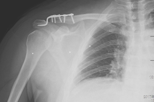 一名50岁的男性患者,因不慎摔伤致右肩关节肿痛,并伴活动受限4天后来附院求治。入院查体发现患者右肩部肿胀明显,右锁骨远端隆起畸形,局部明显按压出现疼痛,肩部外展活动受限,进行X线检查显示“右肩锁关节脱位”。骨三科医师团队根据患者病情,进行充分商讨,确定了手术治疗方案,决定为患者实施“右肩锁关脱位复位带袢钢板内固定术”。由副主任医师蒋宇平主刀,骨三科手术团队在患者锁骨上方及喙突处各取2cm手术切口,将肩锁关节复位后,使用瞄准器由喙突基底部向锁骨远端建立骨性隧道,最后将带袢钢板由骨道穿出后固定,术中出血仅10ml左右。