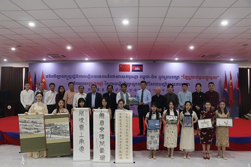 九江学院国际合作交流处处长帅式毅,柬埔寨皇家科学院孔子学院中方院长柴克清,柬埔寨皇家科学院柬方院长苏碧娜(VUTH Sopheakna),巡展团团长、九江学院艺术学院副院长虞斌,巡展团成员谭丹武、王静漪、王祖刚、杨彪,当地社会各界代表及孔院师生300余人参加活动。