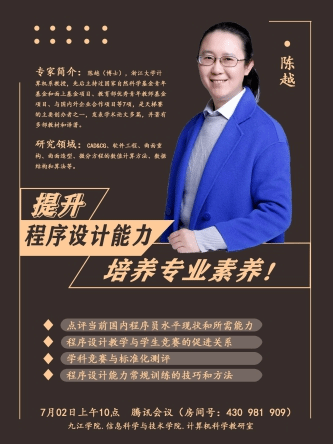 7月2日,信息学院邀请浙江大学计算机学院陈越教授为计算机科学与技术专业的师生作云讲座,讲座的主题围绕提升程序设计能力的有效学习方法,从而培养专业素养展开。本次讲座由曾怡老师主持,信息学院副院长邓长寿教授致欢迎词,计算机科学教研室全体老师和2018级、2019级计算机科学与技术专业全体同学共计300余人聆听了报告。