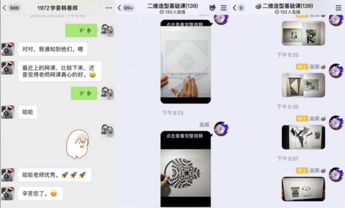 各专业教研室老师纷纷网络集中备课,调整教学方式及教案内容。在视传设计教研室,如副教授吴晖A1972班《二维造型基础》“线的构成”课堂数学中,她提前两个多星期就备好课并制定详细的计划,在给学生们示范教学中,做好如线的面化、线的平衡感构成、线的有序、线的无序自由构成等讲授与实践,且常在课后给学生们看作业答疑解惑,学生们对吴晖老师的网课竖起了大拇指。